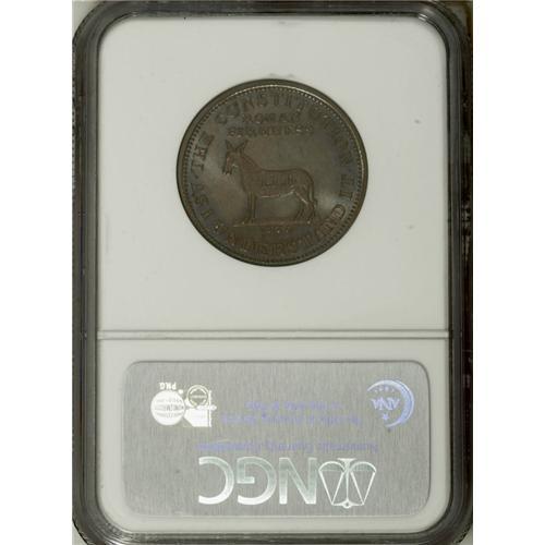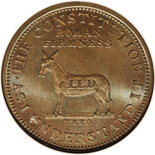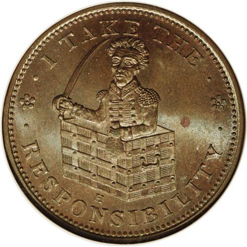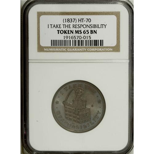 <B>(1833) I Take The Responsibility--Roman Firmness, Low-51, HT-70, MS65 Brown NGC.</B></I> A superb piece with light blue-gray patina over the lustrous surfaces. A small dark area on the obverse is the only thing keeping this piece from an even higher grade. According to Rulau's <I>The Standard Catalog of United States Tokens 1700-1900,</B></I> "Recent research has shown that this token is probably the first cent-sized political type token which achieved wide circulation, and it opened the door for a flood of similar items. The die was cut by Edward Hulseman in Attleboro, Mass. in the fall of 1833, and the tokens were struck by the button-makers, Robinson's Jones & Co. of Attleboro, who were Hulseman's employers 1833-1836."<BR><BR><b>Shipping:</b> Coin/Currency (<a target="_blank" href="http://www.heritageauctions.com/common/shipping.php">view shipping information</a>)