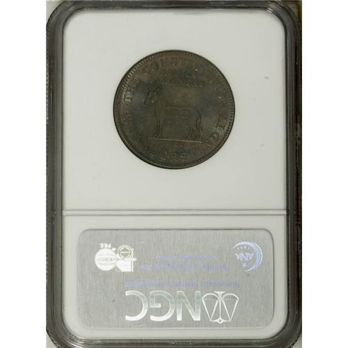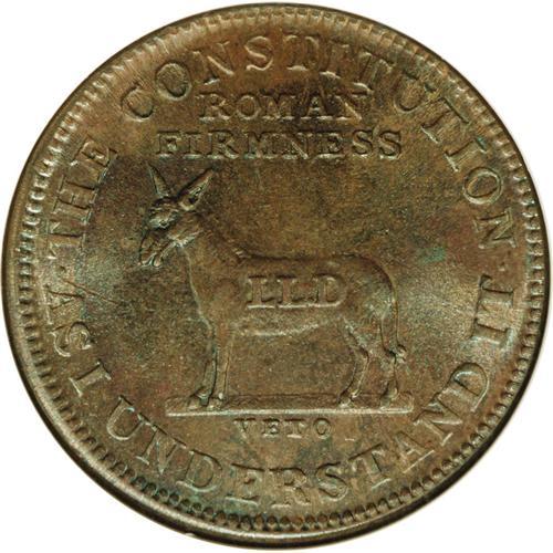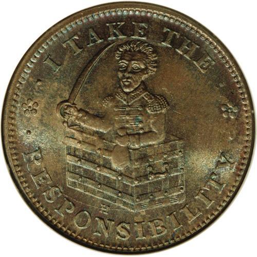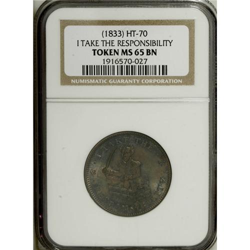 <B>(1833) I Take The Responsibility--Roman Firmness, Low-51, HT-70, R.1, MS65 Brown NGC.</B></I> There is not much that be said for this piece but a big <I>WOW!</B></I> This is not a typical MS65, but one that exhibits iridescent blues and greens over the entire surface. This truly remarkable piece would enhance the finest collection of Hard Times tokens.<BR><BR><b>Shipping:</b> Coin/Currency (<a target="_blank" href="http://www.heritageauctions.com/common/shipping.php">view shipping information</a>)