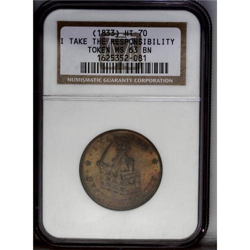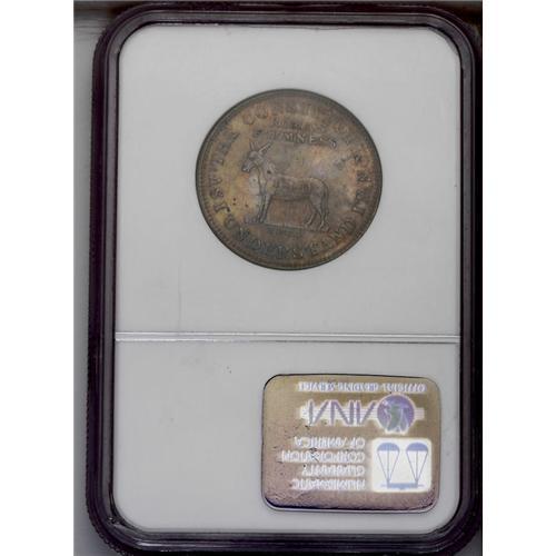 <B>(1833) I Take the Responsibility, Low-51, Rulau-HT-70, R.1, MS63 Brown NGC.</B></I> Bronze. Apricot, powder-blue, and ruby coloration adorn this lustrous and reasonably struck piece. Wispy marks are perceived beneath a glass on the field above the donkey.