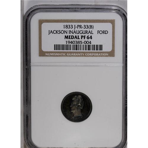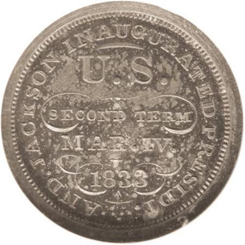 <B>1833 Jackson Inaugural Medal PR64 NGC.</B></I> Julian-PR-33. Silver. 18mm. Attractive cherry-red and apple-green toning invigorates this nicely mirrored example, which has only a few faint obverse hairlines. A light die crack connects the N in SECOND to R in MAR. These decidedly rare medals were struck in gold and silver by the Philadelphia Mint and engraved by Paquet.<BR><I>Ex: F.C.C. Boyd; John J. Ford, Jr. Collection, Part IX (Stack's, 5/05), lot 22 for $632.</B></I> These decidedly rare medals were struck in gold and silver by the Philadelphia Mint and engraved by Paquet. <BR><I>From TheTroy Wiseman Collection</B></I>