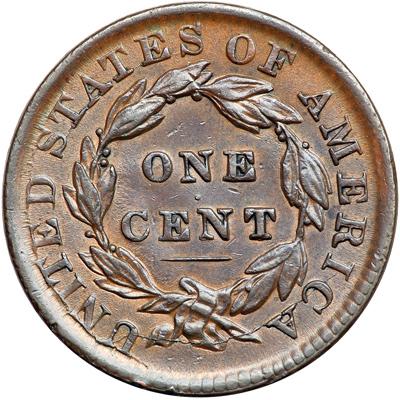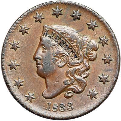 1833 N-1 R2. EF-40. Five points sharper but there is a nick just left of the ear plus a few more on the cheek and a couple tiny rim nicks on the reverse. Frosty medium brown with darker steel brown toning on the highpoints. Hints of very faded mint color can be found on the reverse. LDS. The stars are drawn to the rim and the die cracks on the reverse are strong.