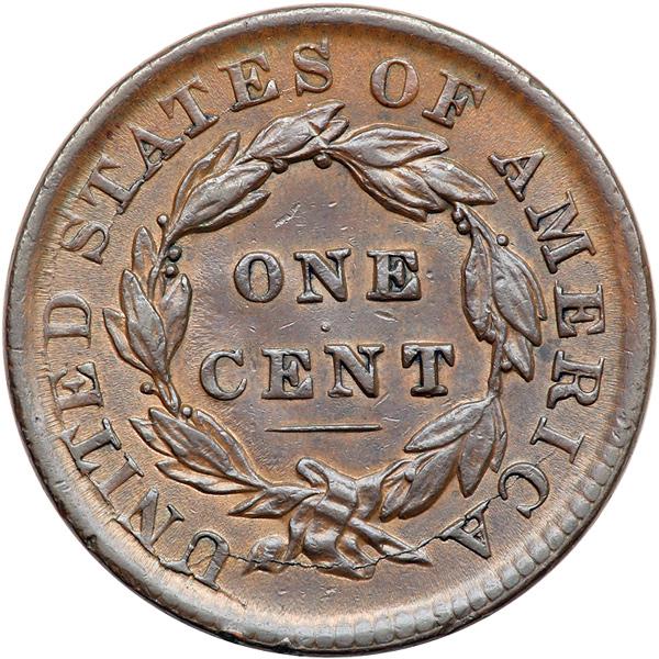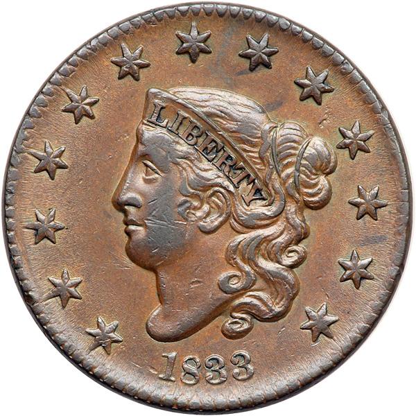 1833 N-1 R2. EF-40. Slightly sharper but there are some nicks on the cheek. Otherwise this cent offers outstanding eye appeal for the grade. Frosty light to medium brown with hints of tan faded down from mint color on the reverse and darker steel brown toning on the highpoints. LDS.