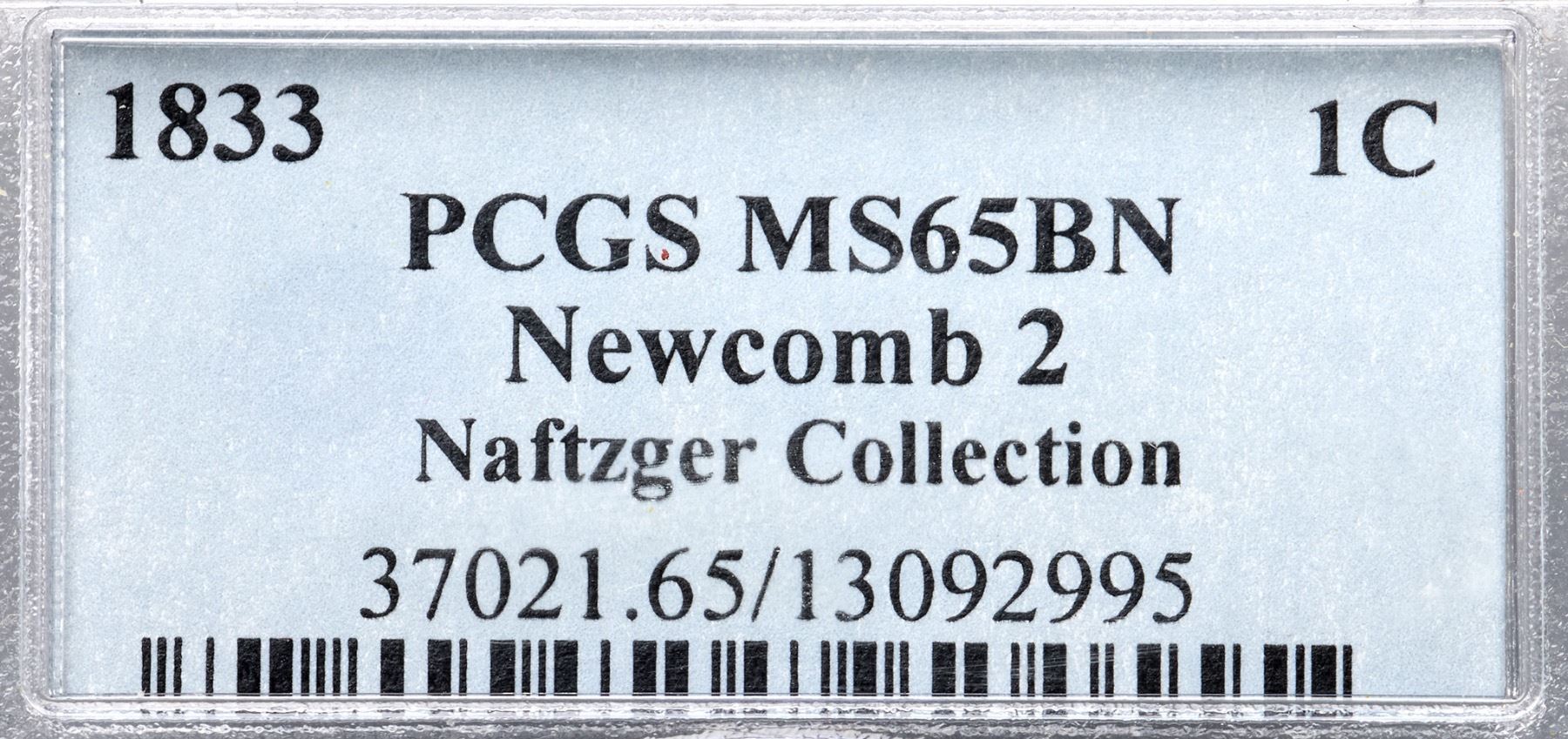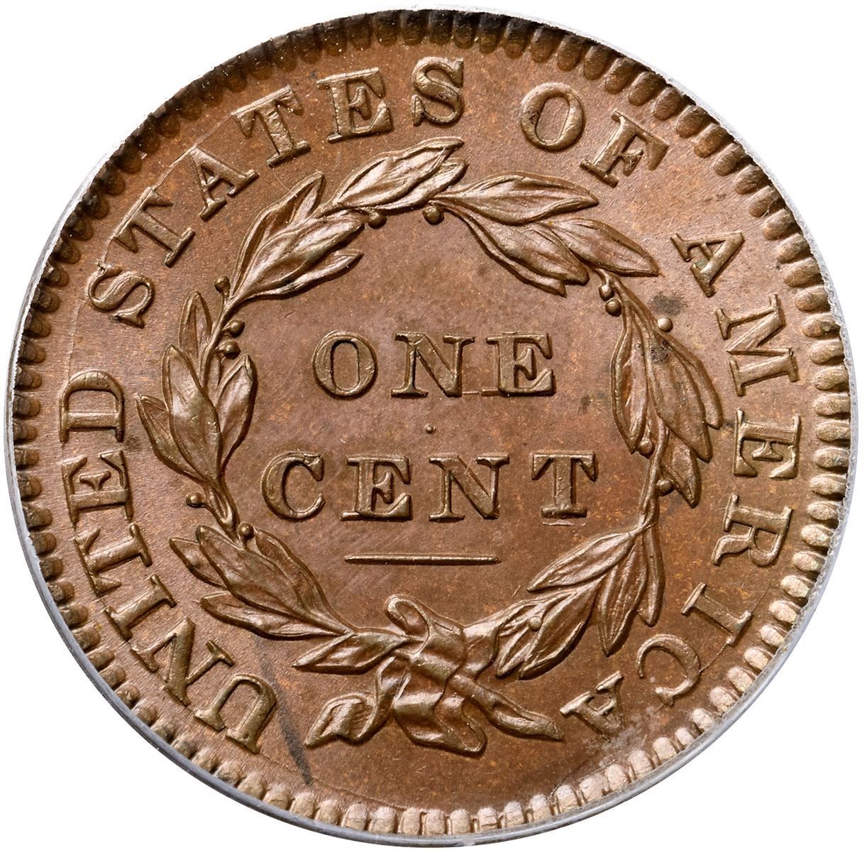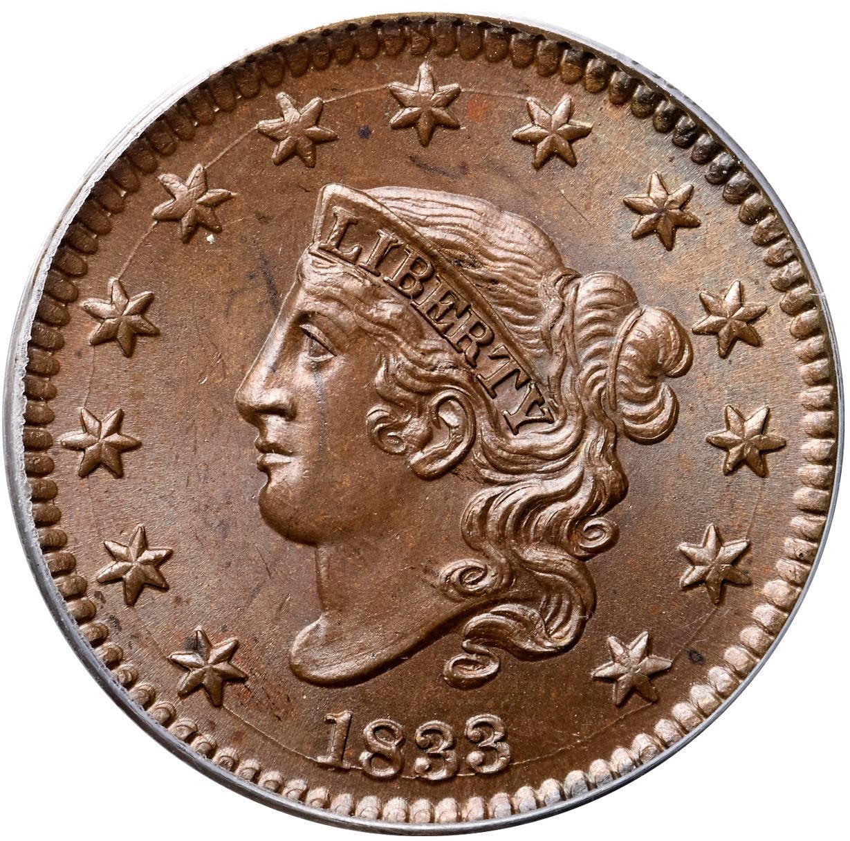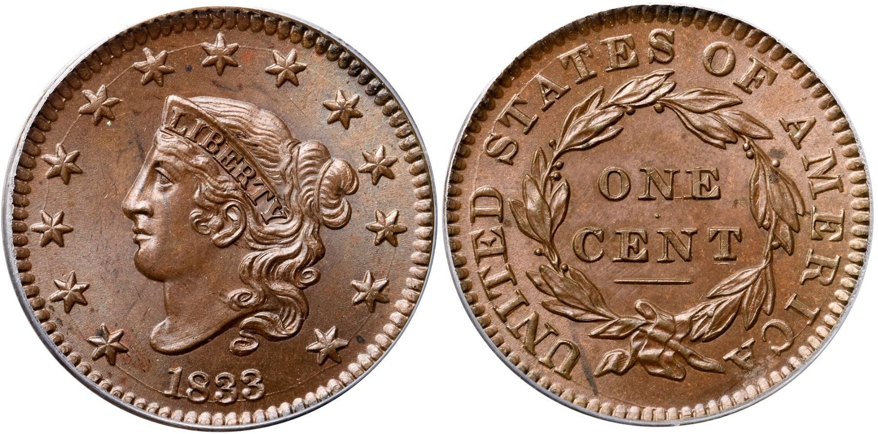 1833 N-2 R2 PCGS graded MS65 BrownLustrous steel brown and light chocolate with subtle overtones of light bluish steel in the fields. The surfaces are satiny and this cent has very nice eye appeal. A faint arc of darker toning from the eye to star 1 plus a few additional wisps of similar toning on both sides are the only notable marks. Sharply struck E-MDS, die state a, with clear repunching on ONE CENT, strongest over the O and below the T. The reverse is rotated 30 degrees CW. This is the plate coin for the die variety in John Wright's 1992 reference The Cent Book 1816-1839. Called MS60+ and tied for CC#6 in the Bland census. Noyes says MS60 and tied for CC#5, his photo #21612. Our grade is MS62.Certificate Number: 37021.65/13092995Pedigree: Ex Frank A. Sternberg, M. H. Bolender MBS 3/2/1956:1657-Louis Helfenstein, Lester Merkin 8/14/1964:144-Stack's-Frank H. Masters, RARCOA 5/14/1971:239-Jack Collins 6/1977-Frank Simon-Ray Chatham-R. S. "Robbie" Brown, Jr., Superior 9/30/1986:735-R. E. "Ted" Naftzger, Jr.-Naftzger Estate, McCawley & Grellman Auctions/Goldbergs 2/1/2009:280-Terry S. Denman Collection