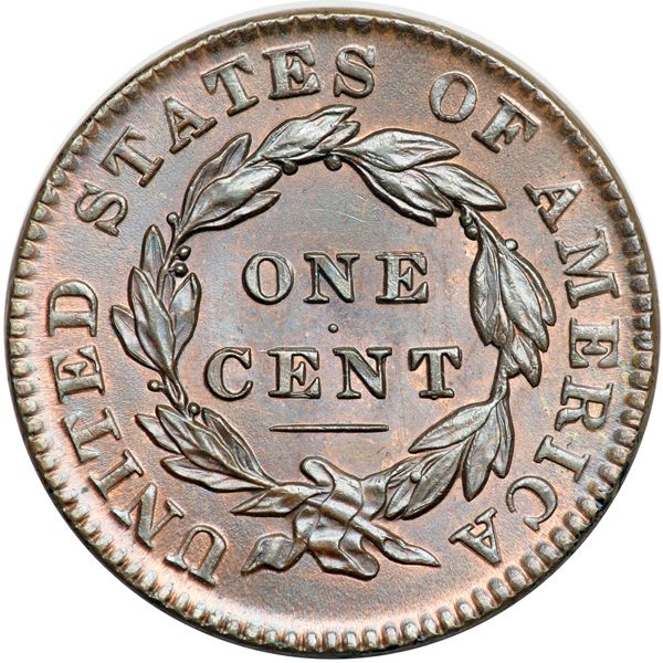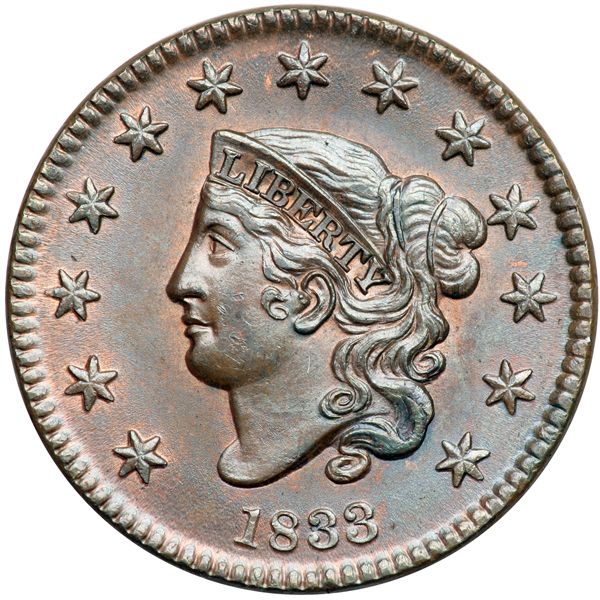 1833 N-3 R1 MS65. Choice highly lustrous bluish steel and chocolate with generous amounts of faded mint color covering the protected areas on both sides. A microscopic tick on the cheek right of the upper lip is the only mark, and it is barely visible with the aid of a strong glass. Nicely struck MDS with microscopic die flowlines covering the fields. All the stars show their radial lines. Called MS65 and tied for CC#1 in the Bland census. Noyes says MS65 choice and tied for CC#1, his photo #20621. A truly beautiful cent. Removed from a PCGS slab graded MS66BN (PCGS label included, and it shows the attribution and Naftzger provenance).