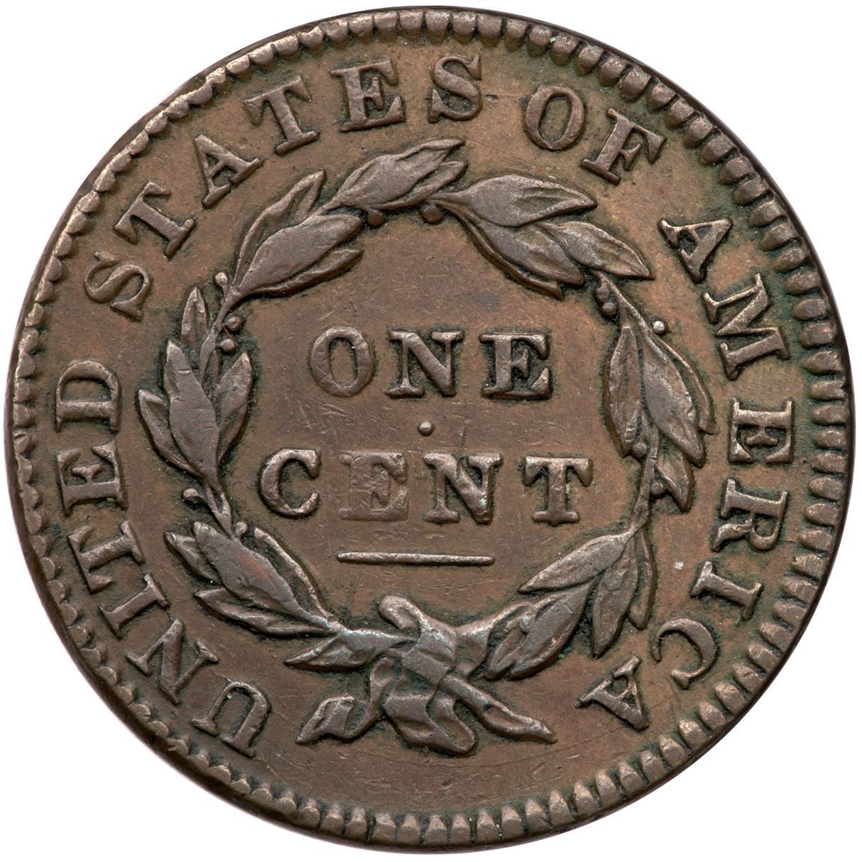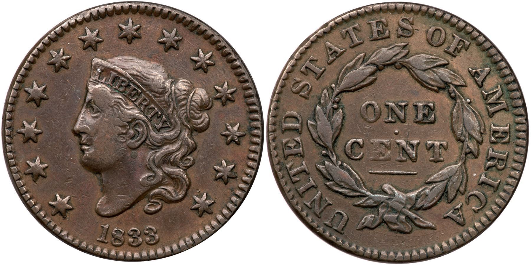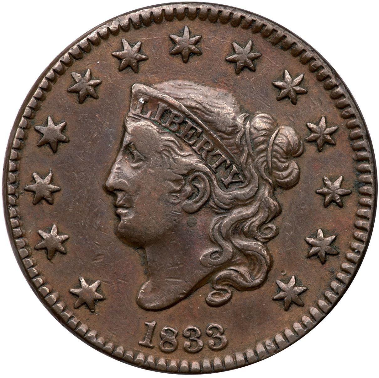 1833 N-5 R-1 VF2010 points sharper but there are minor nicks and traces of old verdigris and crud in some reverse protected areas. The marks are most notable behind the mouth, on either side of the portrait, and on the rim above STATES. Glossy medium chocolate and light browns.Certificate Number: Pedigree: Ex; Tim Paquette