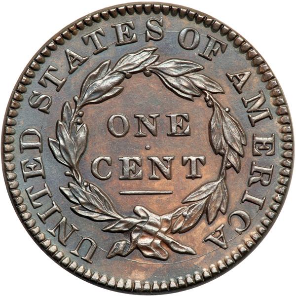 1833 N-5 R1 AU55. Repunched 8. PCGS graded MS-62 Brown. Glossy dark steel brown with some lighter brown in protected areas, mostly on the reverse. A thin, light nick midway between star 3 and the nose tip is the only notable defect. Sharply struck EDS with slightly reflective fields and all the fine die lines crisp, including repunching on the 8. Both sides display fine die cracks, as always, but this example shows the top of a stray 8 in the dentils under the 8 in the date. The reverse is rotated 35 degrees CW. Seldom seen in this very early die state. Our grade is AU55. Pop 1; 2 in 64BN. DWH #0812.