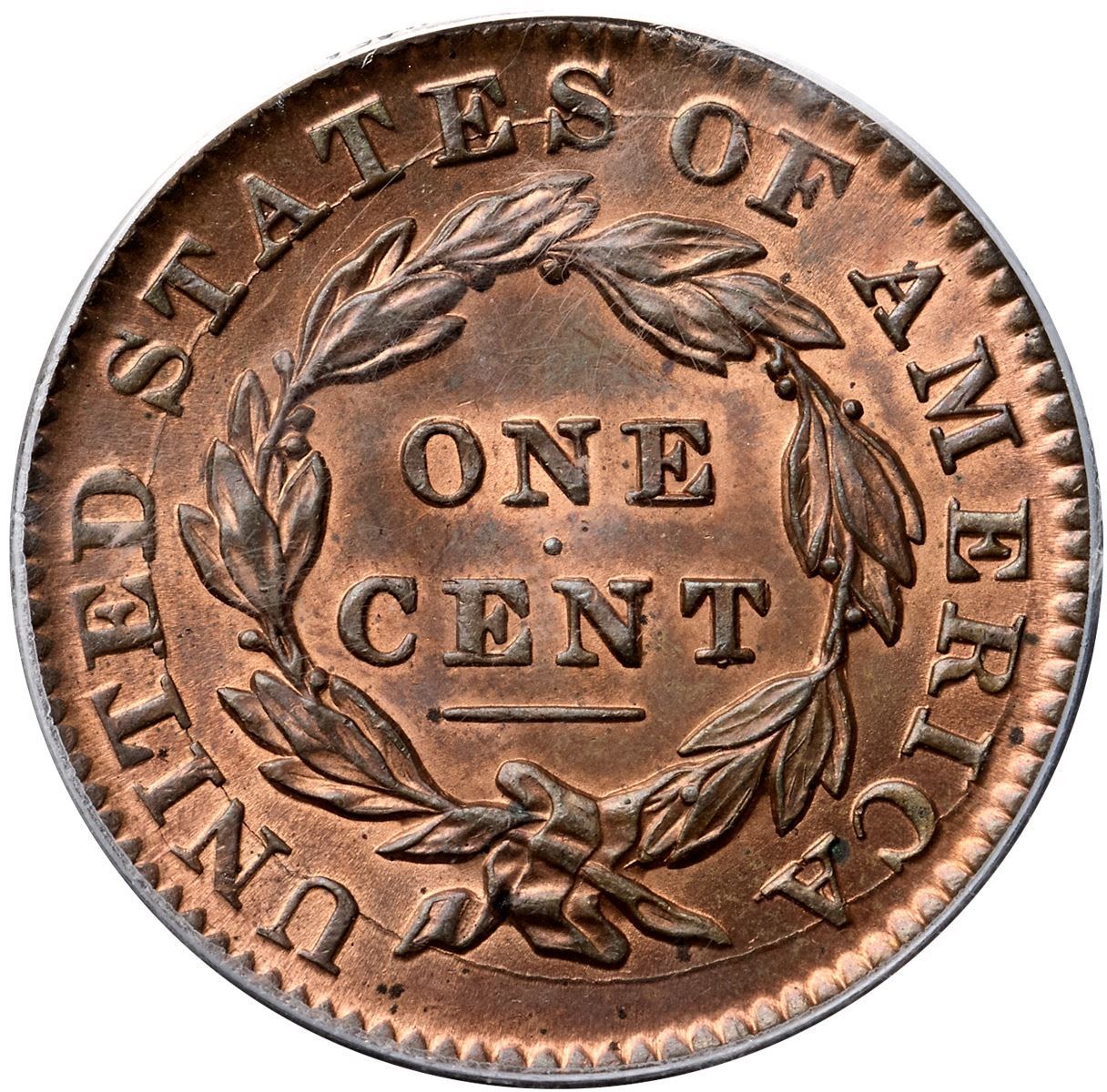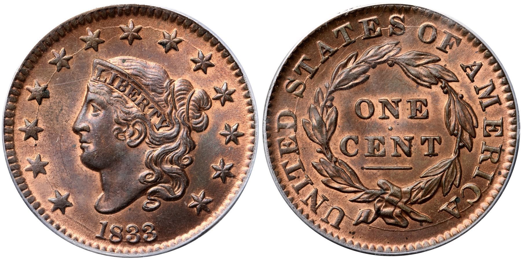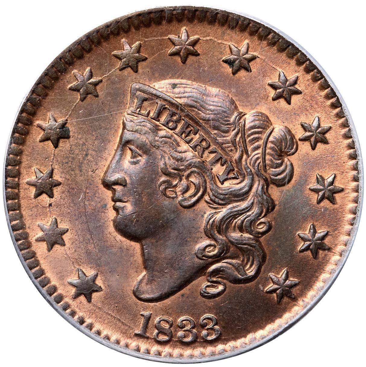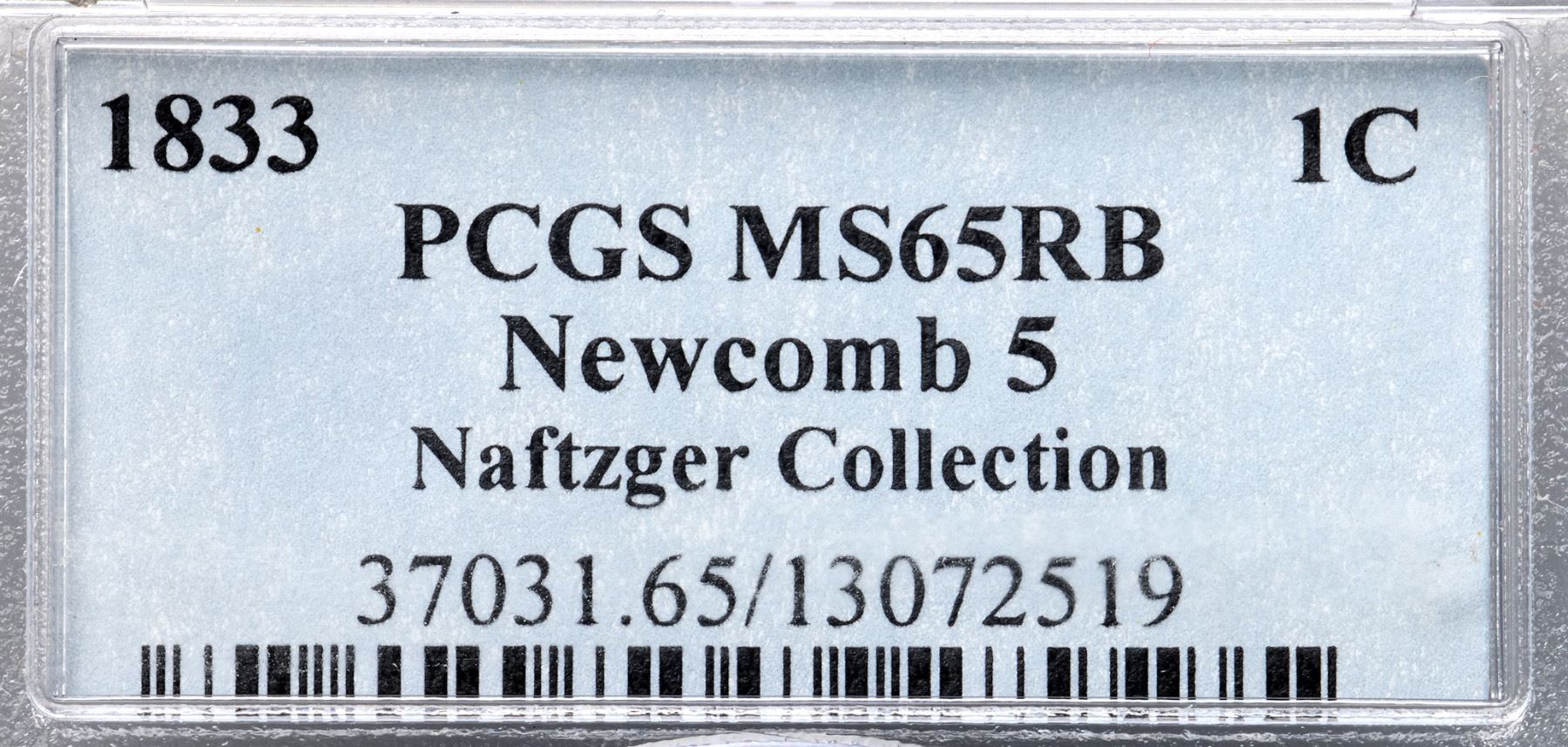 1833 N-5 R1 Repunched 8, PCGS graded MS65 Red & BrownLustrous mint red blending to bluish steel and olive brown with about a third of the mint color remaining on each side. A speck of dark toning in the hair under star 7, an arcing hairline in the field before the mouth, and a few tiny specks of dark toning under the wreath are the notable marks. Only the small spot in the hair catches your eye. Otherwise this cent is satiny and virtually flawless. M-LDS, die state b late, with the repunching on the top of the 8 weak but still visible (the "Horned 8"). Struck with the reverse rotated 40 degrees CW. Called MS63 and tied for CC#5 in the Noyes census, his photo #21562. Our grade is MS64.Certificate Number: 37031.65/13072519Pedigree: Ex Loye L. Lauder, William Doyle Galleries 12/15/1983:420-R. E. "Ted" Naftzger, Jr.-Naftzger Estate, McCawley & Grellman Auctions/Goldbergs 2/1/2009:288-Terry S. Denman Collection