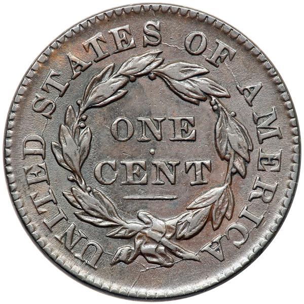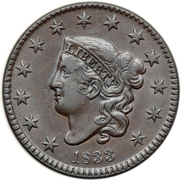 1833 N-6 R1 EF40. Choice frosty chocolate and olive brown. The protected areas are covered with satiny mint luster and this cent offers outstanding eye appeal for the grade. Virtually flawless. MDS with a clear double profile from the forehead down to the chin.