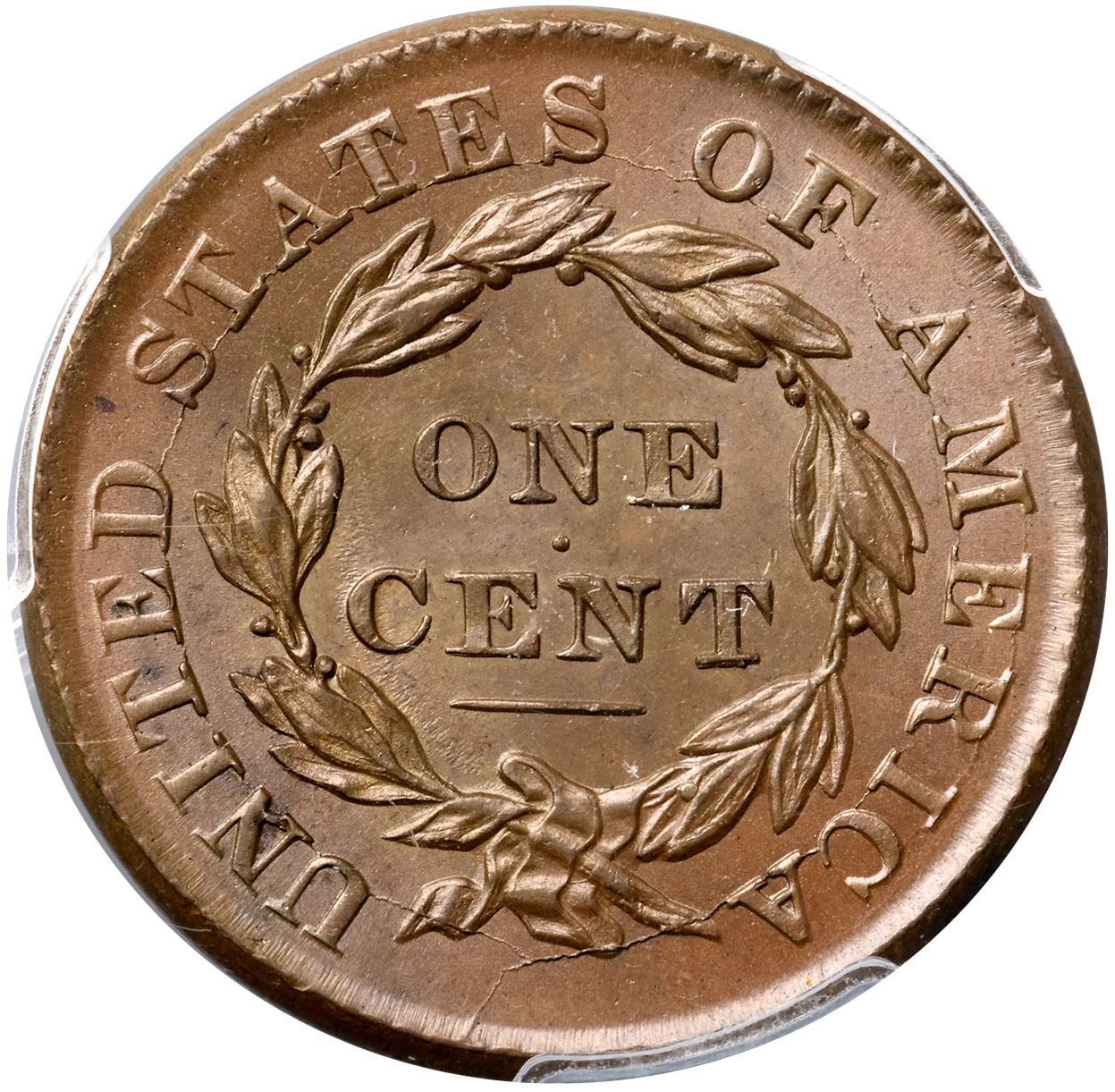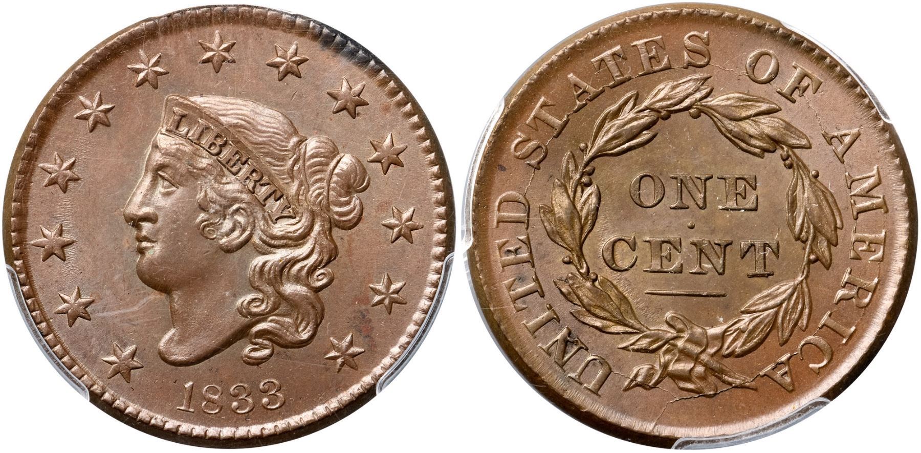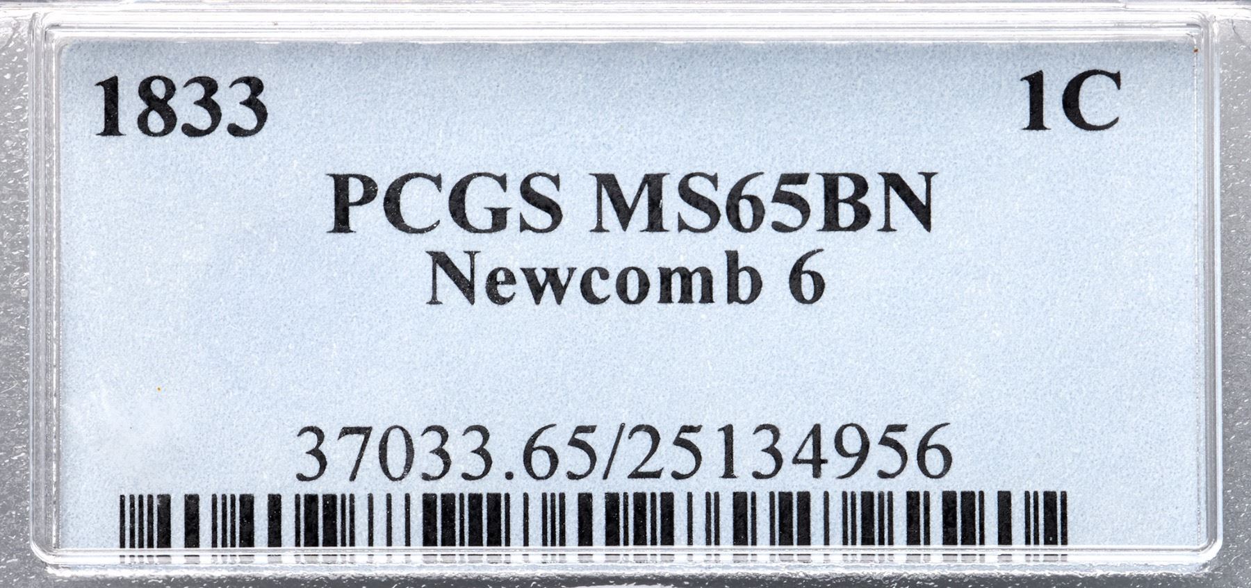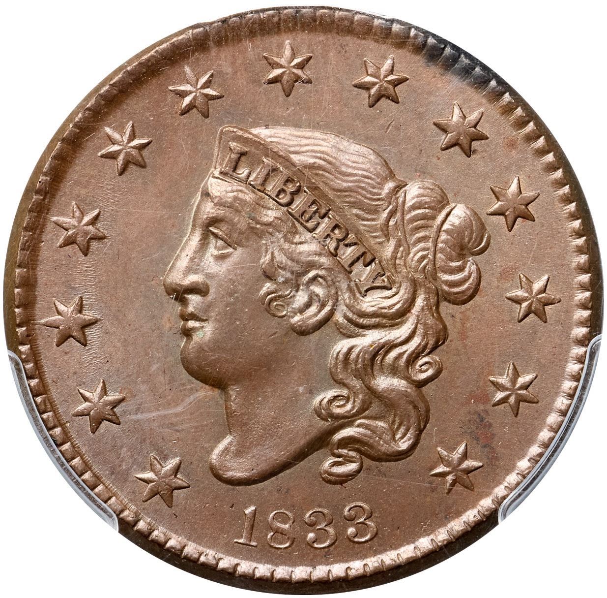 1833 N-6 R1 PCGS graded MS65 BrownVery attractive lustrous bluish steel and light chocolate. The surfaces are satiny and virtually flawless, and this cent has great eye appeal. The only marks are a faint wisp of slightly darker toning between stars 12 & 13, darker steel toning in the dentils from star 8 to star 9, and a speck at the dentil tips left of the first S in STATES. LDS, die state c, with a small lump between the two parallel cracks through the bottom of N in UNITED. Our grade is MS63.Certificate Number: 37033.65/25134956Pedigree: Ex Bowers & Merena 3/1999:1142-Thomas D. Reynolds 2/2005-Paul Gerrie, McCawley & Grellman Auctions/Goldbergs 5/27/2012:37-Terry S. Denman Collection