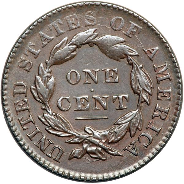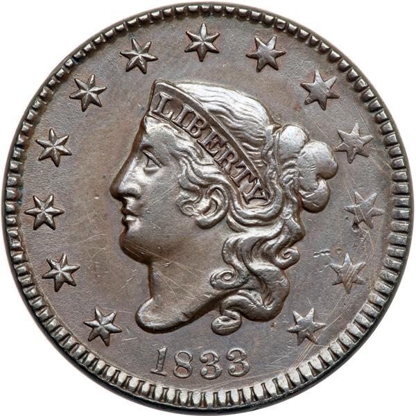 1833 N-6 R1 VF25. Rotated Reverse. VF-25. At least ten points sharper with fine pinscratches at stars 9-13. Otherwise smooth and free of marks. Softly struck at stars 8-13 and on the opposing area at the top of the reverse. Glossy steel and chocolate brown. E-MDS with two fine die cracks passing through the lower part of the N in UNITED, the upper crack faint. The reverse is rotated 85 degrees CW and die bounce has left a triple profile at the tip of the coronet plus sharp doubling and tripling at stars 3-8. DWH #2388.
