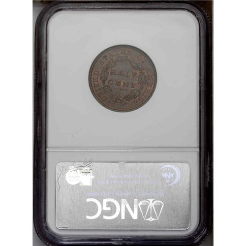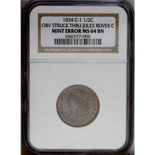 <B>1834<1/2 C> C-1, B-1, R.1. Die State 3. Obverse Struck Thru error. MS64 Brown NGC. MS63 EAC.</B></I> Tall, plain 4; High leaf left of center below S. Latest die state for this issue, and coined after all 1833 production had ceased. Obverse struck through unidentified matter, leaving four light gray trenches across the lower part of the coin. Attractive light olive surfaces with considerable red mint color, especially on the reverse.<BR><I>Ex: Cizik (11/17/1985).</B></I> Envelope Included.
