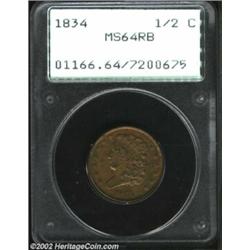 1834 1/2 C MS64 Red and Brown PCGS. B-1, C-1, R.1. Die State 2.0. A sharply struck near-Gem that has
