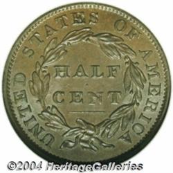 <table><tr><td><table><tr><td>1834 1/2 C MS66 Brown NGC. B-1, C-1, R.1. Manley Die State 2.0. A lovely chocolate-brown premium Gem that displays razor-sharp devices and attractively preserved surfaces. The reverse is especially undisturbed. Struck from clashed dies. The highest NGC-graded Brown 1834 Half Cent, although one piece each has been certified in MS66 Red and Brown and MS65 Red grades.From the Robert Bowling Collection. <BR><BR><B>Important notice:</B> Heritage usually auctions material at the rate of 200-250 lots per hour. On some occasions eBay Live bid software or the Internet may not be able to keep up with the pace of the auction. We recommend placing a realistic absentee bid now as insurance to avoid disappointment. Occasionally the auctioneer may eliminate or reject an eBay Live bid, and the auctioneer may also reopen a lot after the close of the eBay live bidding (usually because we missed an audience bid), and may reject your bid even if it shows you as the winning bidder. By bidding via eBay Live, you agree that Heritage may award the lot to another bidder at its sole discretion under the circumstances described above or any other reasonable circumstances. Since eBay bids are not shown to us until we open the lot on the floor, we treat those bids just like floor bids. In most cases the floor responds before the eBay bid is presented to us, due to Internet lag time, so for consistency we have made it a policy that floor bids are always considered first over tie eBay live bids. Also please note that all Heritage lots purchased through eBay Live carry a 20% Buyer's Premium. Please make sure you read the Terms and Conditions before you bid. <BR><BR><B>IMPORTANT ANNOUNCEMENT ABOUT RESERVES:</B> Heritage now divulges all reserves on its web site 7 days before every auction. If you want to know whether the reserve on this lot has been met, and if not, what the reserve amount is, please visit this lot page on the HeritageCoin.com web site, or email: bid@HeritageGalleries.com </span></font></td></tr></table></td></tr></table>