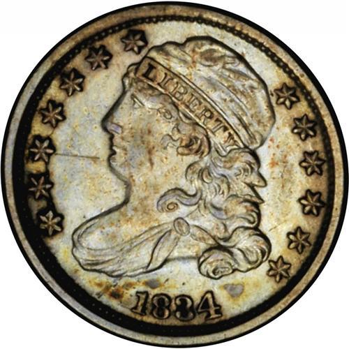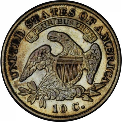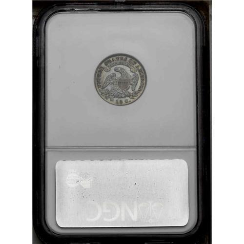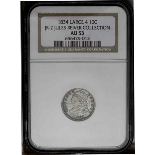 <B>1834<10C> Large 4 JR-2, R.3. Reiver state b. AU53 NGC.</B></I> Dark gunmetal gray throughout with lighter yellow hues through the stars and reverse legend. Sharply struck for this issue, with strong radial centers on the stars, and the centers reasonably sharp as well. There is a thin scratch from the third star to Liberty's chin and two dark charcoal spots near the date. The present coin has the usual die crack through the first three stars. Once thought to be scarce, quite a number of this variety have turned up reducing the rarity rating substantially in the past two decades.<BR><I>Ex: Stack's (August 1989).</B></I> Envelope Included.