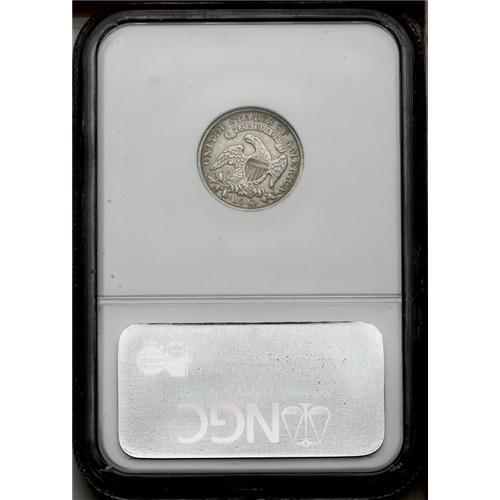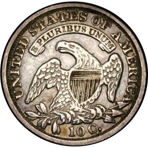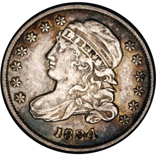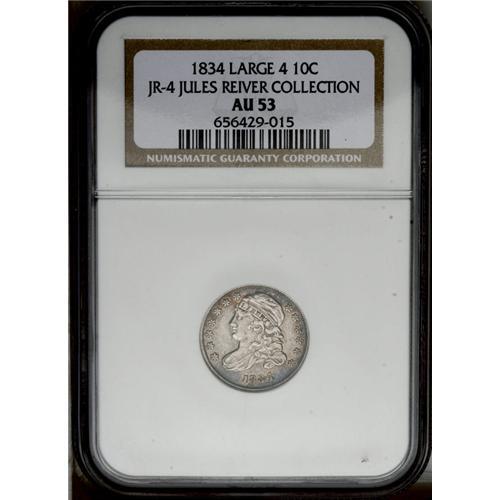 <B>1834<10C> Large 4 JR-4, R.3. Reiver state a. AU53 NGC.</B></I> Silver-gray with patches of blue around the periphery. Sharply struck as usual for this variety, and this is the middle die state with a tiny die crack (or engravers scratch) from the rim to the upper olive leaf. Areas of residual soap through the reverse lettering and devices.<BR><I>Ex: Foreman (July 1988).</B></I> Envelope Included.