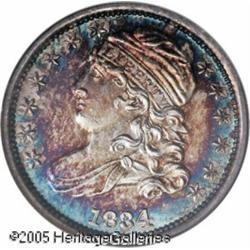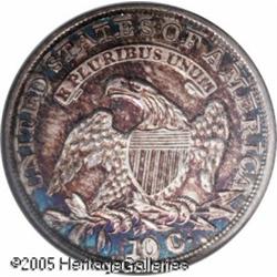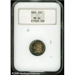 <B>1834 10C Large 4 MS64 NGC.</B></I> JR-1, R.1. Attributed by the double shaft on the top arrow. This beautifully toned example reveals blushes of crimson, orange-gold, and cobalt-blue color over lustrous surfaces. The design elements are sharply struck throughout, with sharp definition apparent in Liberty's hair curls, the clasp, the star centers, the eagle's feathers, and the shield lines. One tiny mark is noted on Liberty's chin, and might serve as a future pedigree marker. This near-Gem offers considerable eye appeal, and should easily attract the attention of the Capped Bust dime specialist. Population: 40 in 64, 29 finer (1/05). Lot:6194