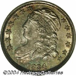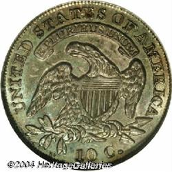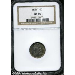 <B>1834<10C> Large 4 MS65 NGC.</B></I> JR-2, R-3. Aquamarine, rose, and battleship-gray patina graces this shimmering and meticulously struck Gem. Exceptionally preserved, and worthy of evaluation by the devoted specialist. The D in UNITED is unusually large on this scarce variety, perhaps a punch intended for a larger denomination was mistakenly utilized. A late die state that has a bold crack (as made) through the initial five stars and prominent clash marks (as produced) on both sides. <BR><BR><B>Important notice:</B> Heritage usually auctions material at the rate of 200-250 lots per hour. On some occasions eBay Live bid software or the Internet may not be able to keep up with the pace of the auction. We recommend placing a realistic absentee bid now as insurance to avoid disappointment. Occasionally the auctioneer may eliminate or reject an eBay Live bid, and the auctioneer may also reopen a lot after the close of the eBay live bidding (usually because we missed an audience bid), and may reject your bid even if it shows you as the winning bidder. By bidding via eBay Live, you agree that Heritage may award the lot to another bidder at its sole discretion under the circumstances described above or any other reasonable circumstances. Since eBay bids are not shown to us until we open the lot on the floor, we treat those bids just like floor bids. In most cases the floor responds before the eBay bid is presented to us, due to Internet lag time, so for consistency we have made it a policy that floor bids are always considered first over tie eBay live bids. Also please note that all Heritage lots purchased through eBay Live carry a 20% Buyer's Premium. Please make sure you read the Terms and Conditions before you bid.