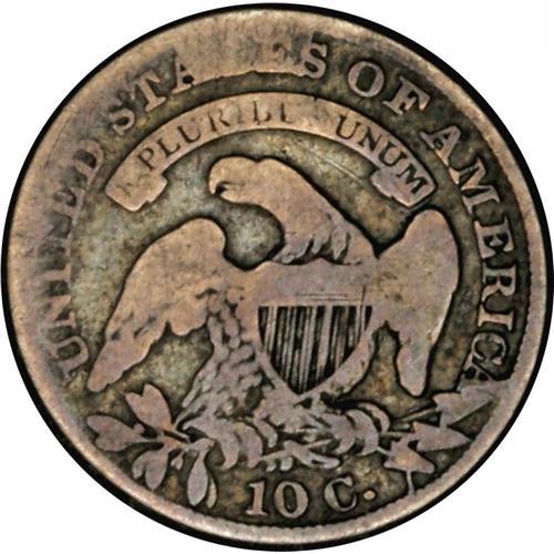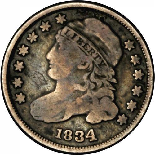 <B>1834<10C> Large 4 JR-6, R.2. Reiver state e.--Obverse Damage--NCS. VG Details.</B></I> Dark gray in the fields, lighter on the devices. There is a tiny attempted puncture above Liberty's cap and a small rough area in the left obverse field, neither of which warrants attention. An interesting reverse die state, as there appears to be an advanced retained cud through ATES, but this is more a function of coin wear than die deterioration. Several <I>later</B></I> die states are included in this collection where the die sinking on ATES is scarcely noticeable on these higher grade specimens which were struck well after the present coin. The die crack through MERIC has barely started to form, while the die crack through the final A of AMERICA and the three arrowheads has already become heavy. An interesting intermediate die state to study.<BR><I>Ex: Julian Leidman (June 1996).</B></I> Envelope Included.