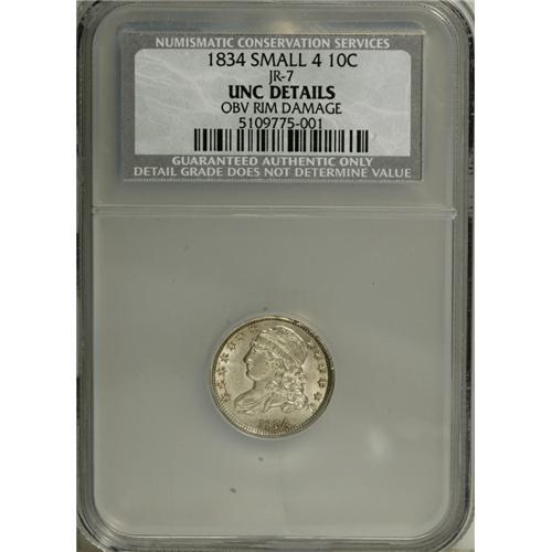 <B>1834 10C Large 4--Obverse Rim Damage--NCS. Unc. Details.</B></I> JR-1, R.1. Misattributed by NGC as JR-7, the Small 4 variety. A boldly struck and lightly toned piece with pleasing mint luster. Close inspection locates obverse rim impressions between 12 and 1 o'clock.<BR><BR><b>Shipping:</b> Coins & Currency (<a target="_blank" href="http://www.heritageauctions.com/common/shipping.php">view shipping information</a>)