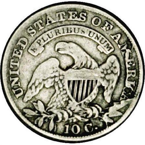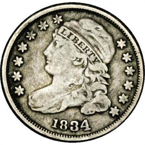 <B>1834<10C> Large 4 JR-6, R.1. Reiver state h. VF30 NGC.</B></I> Medium gray with darker charcoal patches near the periphery. A very late reverse die state with a retained cud through ATES, another through MERIC and yet another through the final A of AMERICA and the three arrowheads. So far as is known, none of these retained cuds advanced much further or became full cuds, and the reverse die was retired after this marriage. While not a particularly scarce retained cud to obtain, this is one of the most interesting with three separate areas of the same die falling apart simultaneously. An impressive coin the numismatist.<BR><I>Ex: Julian Leidman (June 1996).</B></I> Envelope Included.