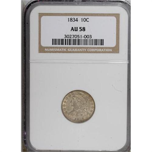 <B>1834 10C Small 4 AU58 NGC.</B></I> NGC Census: (33/148). PCGS Population (22/80). Mintage: 635,000. Numismedia Wsl. Price for NGC/PCGS coin in AU58: $392. (#4525)<BR><BR><B>Coin Engraver:</B> John Reich<BR><BR><b>Shipping:</b> Coins & Currency (<a target="_blank" href="http://www.heritageauctions.com/common/shipping.php">view shipping information</a>)