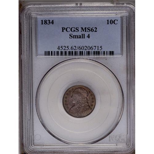 1834 10C Small 4 MS62 PCGS. JR-7, R.2. Lustrous surfac 1834