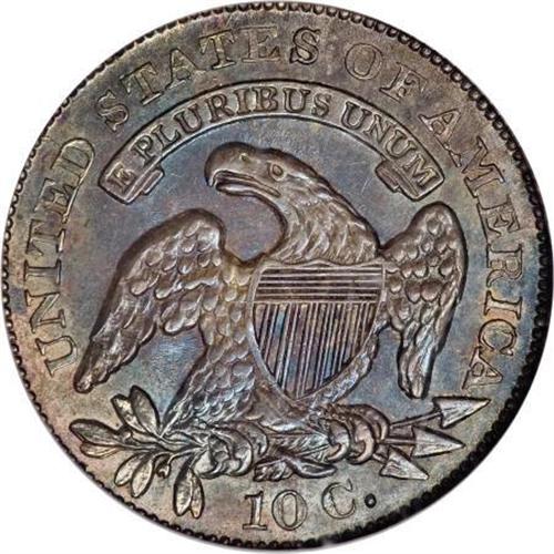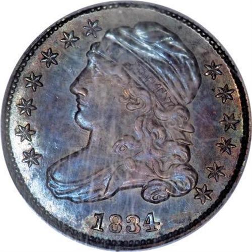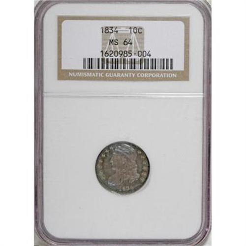 <B>1834 10C Small 4 MS64 NGC.</B></I> JR-7, R.2. The Small 4 variety is distinguished by an extended, undamaged serif on the 4 in the date. Both sides of this carefully preserved, strongly lustrous representative have rich blue-green patina in the centers and paler aqua toning at the margins. Well struck with excellent eye appeal and a noteworthy example of this later Bust dime. Census: 42 in 64, 28 finer (6/07).<BR><BR><B>Coin Engraver:</B> John Reich<BR><BR><b>Shipping:</b> Coins & Currency (<a target="_blank" href="http://www.heritageauctions.com/common/shipping.php">view shipping information</a>\)