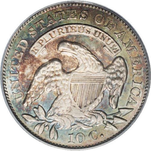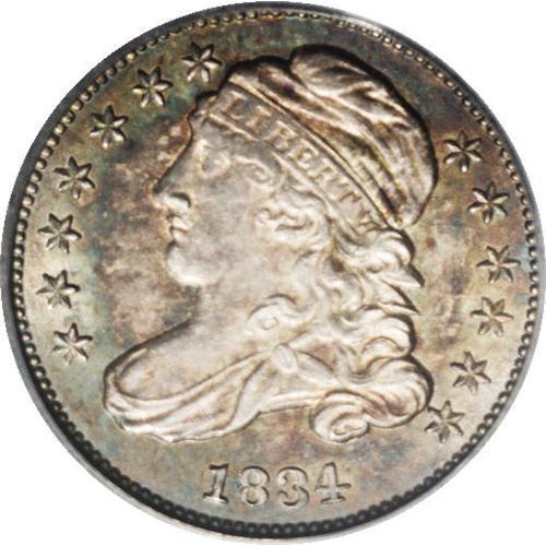 <B>1834<10C> Small 4 MS64 PCGS.</B></I> JR-7, R.2. This die pairing is easily distinguished by the long, well formed serif on the 4 in the date. The surfaces are beautifully toned in deep dusky rose, magenta, and ocean-blue. The strike is well executed except on the arrow feathers and claws, and on the hair below LIBERTY. An appealing and collectible example. Population: 27 in 64, 10 finer (1/06).