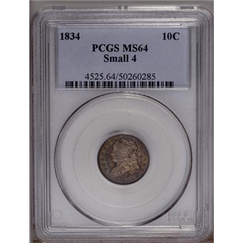 1834 10C Small 4 MS64 PCGS. JR-7, R.2. This die pairin 1834[10C] Small 4 MS64 PCGS.