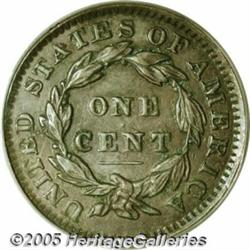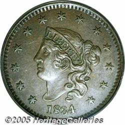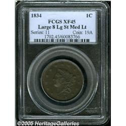 <B>1834 1C Large 8, Large Stars, Medium Letters XF45 PCGS.</B></I> N-3, High R.1. Four different types of 1834 cents are listed in the <I>Guide Book,</B></I> and just seven die marriages are known. This is a highly collectible example that displays deep, even brown patina covers each side of this sharply struck example. There is a slight outline of corrosion around the letters and devices on the reverse.