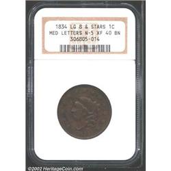 1834 1C Large 8 Large Stars Medium Letters XF40 NGC. N-5, High R.5. Alternately medium and dark brown in color with pleasing surfaces. The details are sharper in the centers than at the borders. The obverse has a lengthy peripheral die crack (as struck) that has faded with wear. Several letters of the denomination have been recut, with the O in ONE leaning awkwardly to the left. The dies are slightly rotated. An elusive variety that carries a large premium even in lower circulated grades. Important notice: We expect to be auctioning lots at the rate of 200-250 per hour. Sometimes eBay Premier live bid software cannot keep up with that pace, so we strongly recommend that you place a realistic proxy bid now as insurance to avoid disappointment. Also please note that all Heritage/CAA lots purchased through eBay Premier carry a 20% Buyer's Premium.