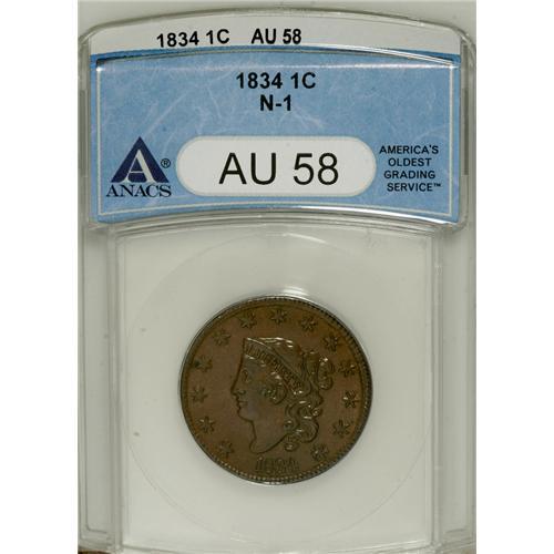 <B>1834 1C Large 8, Small Stars, Medium Letters AU58 ANACS.</B></I> N-1. NGC Census: (23/81). PCGS Population (10/31). Mintage: 1,855,100. Numismedia Wsl. Price for NGC/PCGS coin in AU58: $300. (#1699)<BR><BR><b>Shipping:</b> Coins & Currency (<a target="_blank" href="http://www.heritageauctions.com/common/shipping.php">view shipping information</a>)