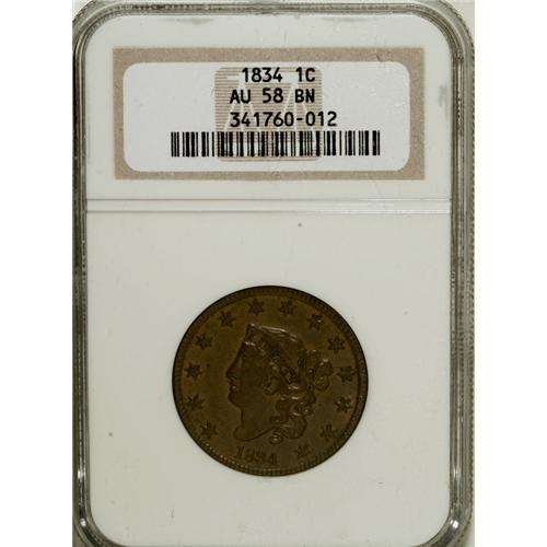 <B>1834 1C Large 8, Small Stars, Medium Letters AU58 NGC.</B></I> NGC Census: (46/162). PCGS Population (10/31). Mintage: 1,855,100. Numismedia Wsl. Price for NGC/PCGS coin in AU58: $300. (#1699)<BR><BR><b>Shipping:</b> Coins & Currency (<a target="_blank" href="http://www.heritageauctions.com/common/shipping.php">view shipping information</a>)