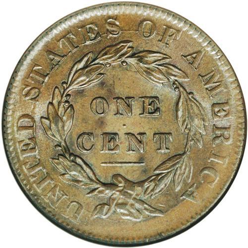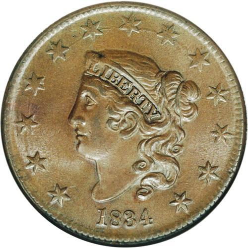 <B>1834 1C Large 8, Small Stars, Medium Letters MS65 Brown NGC.</B></I> N-1, R.1. A frosty medium brown cent with fully lustrous surfaces and traces of orange luster. Splashes of darker color are present on both sides. A lovely example. EAC 60.