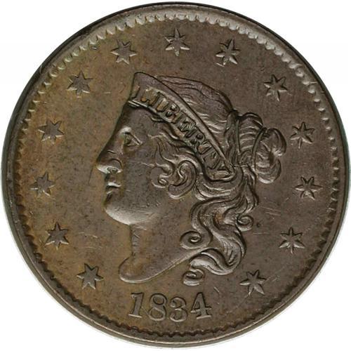 <B>1834<1C> Large 8, Small Stars, Medium Letters. N-3, R.1. AU55 NGC. VF30 EAC.</B></I> Double Profile only at the lips and chin. A later die state with the obverse cracked through stars 12 and 13. Light olive and tan coloration with darker steel toning at the right side of the obverse.<BR><I>Ex: George Ramont (4/18/1973).</B></I>