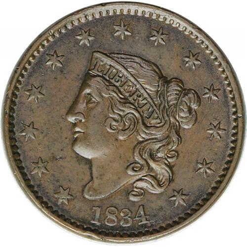 <B>1834<1C> Large 8, Small Stars, Medium Letters. N-4, High R.2--Improperly Cleaned--NCS. Unc Details. XF40 EAC.</B></I> A late die state for this variety, with an obverse crack through stars 12 and 13. This obverse die was used in its earliest state for N-3, followed by all examples of N-4, and then for the latest states of N-3. Olive and steel brown surfaces.<BR><I>Ex: Garry Fitzgerald (11/13/1968).</B></I>