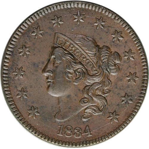 <B>1834<1C> Large 8, Large Stars, Large Letters.N-6, R.3--Environmental Damage--NCS. AU Details. XF45 EAC.</B></I> Not only is this a double profile, but the central reverse letters ONE CENT are also doubled. Although technically not a one variety type, for all practical purposes this is the only die marriage of the Large 8 and Stars, Large Letters listing in the <I>Guide Book.</B></I> The only other variety to meet this same description is the Proof-only 1834 N-7 variety. The obverse is medium brown in color with splashes of darker steel and traces of luster. The reverse is bright olive-green with some darker corrosion. The reverse is rotated about 30 degrees clockwise. Although not in the Condition Census for the variety, this is an important example and certainly ranks in the top 20 pieces known.<BR><I>Ex: George Ramont (5/11/1978).</B></I>