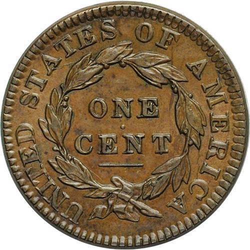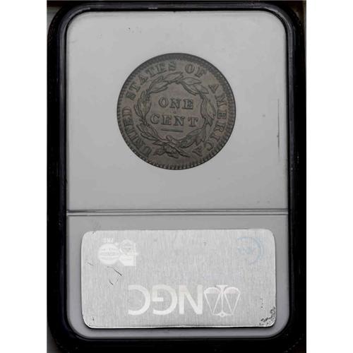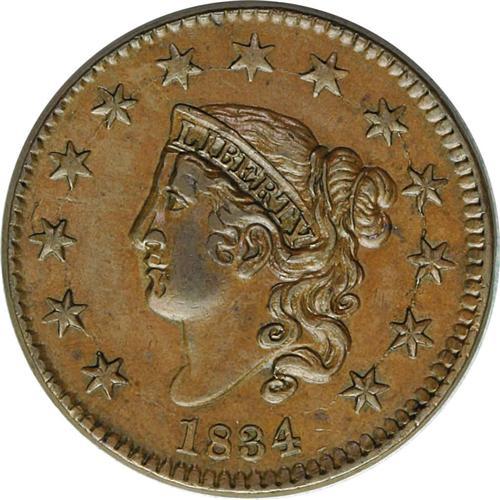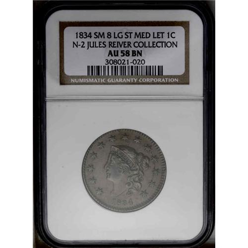 <B>1834<1C> Small 8, Large Stars, Medium Letters. N-2, R.1. AU58 NGC. XF40 EAC.</B></I> Medium brown with smooth, glossy surfaces. Some minor marks. There is an ancient, faint pinscratch from the rim below the wreath stem to the leaves under C in CENT. There is a huge double profile from the forehead to the chin.<BR><I>Ex: George Ramont (8/9/1977).</B></I> Envelope Included.