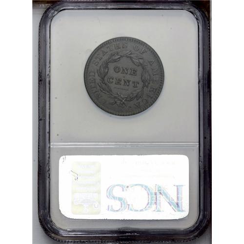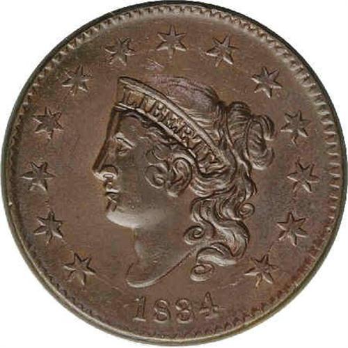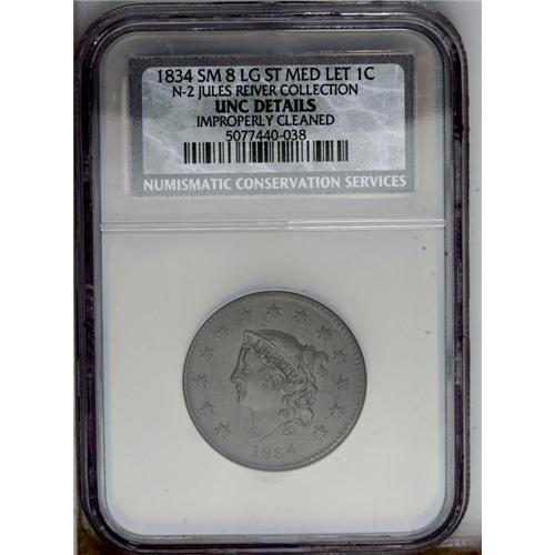 <B>1834<1C> Small 8, Large Stars, Medium Letters. N-2, R.1--Improperly Cleaned--NCS. Unc Details. VF35 EAC.</B></I> Late Die State. Liberty's profile is tripled. The charcoal-brown surfaces are rather glossy, from an improper cleaning at some point in the past. Minor clockwise die rotation is noted. Light wear is evident on the highpoints, and there are no distracting abrasions on either side of the coin.<BR><I>Ex: Dill (10/18/1969).</B></I> Envelope Included.