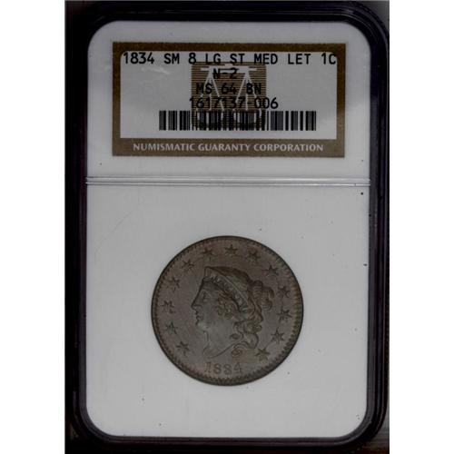 <B>1834<1C> Small 8, Large Stars, Medium Letters MS64 Brown NGC.</B></I> N-2, R.1. Fully lustrous surfaces exhibit splendid medium brown color with traces of rub on the highest points, including a couple of brighter copper areas. Otherwise, the surfaces have only a few tiny abrasions. This is a late die state example with crumbling of the die located above the left foot of Y. Peripheral obverse and minor reverse die cracks are present as always. EAC 55.<BR><I>From The Craig A. Stevens Registry Collection of Large Cents.</B></I> <BR><BR><B>Important notice:</B> Heritage usually auctions material at the rate of 200-250 lots per hour. On some occasions eBay Live bid software or the Internet may not be able to keep up with the pace of the auction. We recommend placing a realistic absentee bid now as insurance to avoid disappointment. Occasionally the auctioneer may eliminate or reject an eBay Live bid, and the auctioneer may also reopen a lot after the close of the eBay live bidding (usually because we missed an audience bid), and may reject your bid even if it shows you as the winning bidder. By bidding via eBay Live, you agree that Heritage may award the lot to another bidder at its sole discretion under the circumstances described above or any other reasonable circumstances. Since eBay bids are not shown to us until we open the lot on the floor, we treat those bids just like floor bids. In most cases the floor responds before the eBay bid is presented to us, due to Internet lag time, so for consistency we have made it a policy that floor bids are always considered first over tie eBay live bids. Also please note that all Heritage lots purchased through eBay Live carry a 20% Buyer's Premium. Please make sure you read the Terms and Conditions before you bid. This lot is being auctioned in conjunction with a live floor auction by Heritage Galleries & Auctioneers. All final auction and invoice information will be supplied by Heritage Galleries & Auctioneers, and all other information should be considered preliminary. Lot:284 <BR><BR><B>Winning Notification and Billing:</B> After the FINAL session in this auction is complete, Heritage will send e-mail and snail mail invoices. This process normally takes several days. All final auction and invoice information will be supplied by Heritage Galleries & Auctioneers, and all other information should be considered preliminary. <BR><BR>This auction will be conducted on a live auction floor and over the Internet through eBay Live. If you choose to place an absentee bid, please take a moment to <font color='#0000ff'><u><a href='http://pages.ebay.com/liveauctions/help/before/laabsentee.html'>learn how eBay Live absentee bidding works</a></u></font><font color='#000000'>