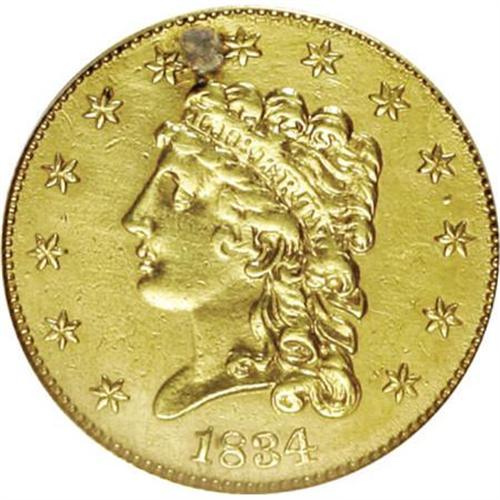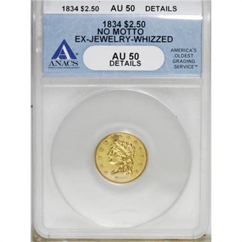 <B>1834 $2 1/2 Classic--Ex-Jewelry, Whizzed--ANACS. AU50 Details.</B></I> NGC Census: (34/726). PCGS Population (65/368). Mintage: 112,234. Numismedia Wsl. Price for NGC/PCGS coin in AU50: $1,165. (#7692)<BR><BR><B>Coin Engraver:</B> William Kneass<BR><BR><b>Shipping:</b> Coins & Currency (<a target="_blank" href="http://www.heritageauctions.com/common/shipping.php">view shipping information</a>)
