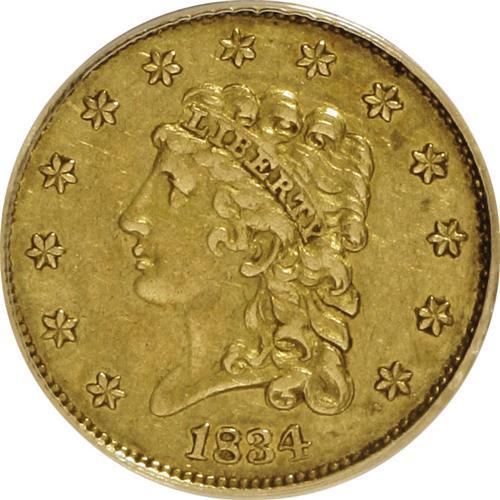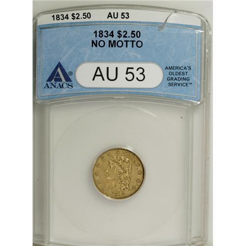 <B>1834 $2 1/2 Classic AU53 ANACS.</B></I> NGC Census: (120/1270). PCGS Population (39/317). Mintage: 112,234. Numismedia Wsl. Price for NGC/PCGS coin in AU53: $1,200. (#7692)<BR><BR><b>Shipping:</b> Coins & Currency (<a target="_blank" href="http://www.heritageauctions.com/common/shipping.php">view shipping information</a>)