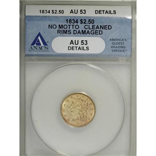<B>1834 $2 1/2 Classic--Cleaned, Rim Damaged--ANACS AU53 Details.</B></I> NGC Census: (61/671). PCGS Population (42/332). Mintage: 112,234. Numismedia Wsl. Price for NGC/PCGS coin in AU53: $1,200. (#7692)<BR><BR><B>Coin Engraver:</B> William Kneass<BR><BR><b>Shipping:</b> Coins & Currency (<a target="_blank" href="http://www.heritageauctions.com/common/shipping.php">view shipping information</a>)