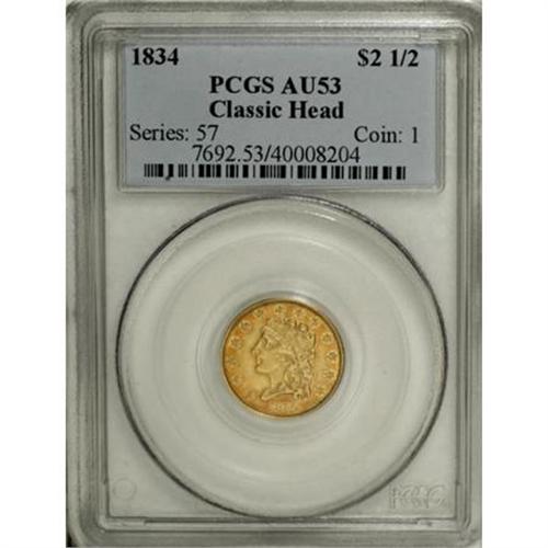 <B>1834 $2 1/2 Classic AU53 PCGS.</B></I> Large Head, Breen-6140, McCloskey-C, R.3. The portrait has prominent curls, and the reverse shows a closely spaced AM and a tongue in the eagle's mouth. Yellow-gold surfaces display hints of luster and yellow-gold patina blushed with apricot. Sharp and even definition shows on the design elements.<BR><BR><B>Coin Engraver:</B> William Kneass<BR><BR><b>Shipping:</b> Coins & Currency (<a target="_blank" href="http://www.heritageauctions.com/common/shipping.php">view shipping information</a>)