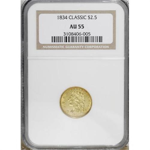 <B>1834 $2 1/2 Classic AU55 NGC.</B></I> Large Head, Breen-6140, McCloskey-C, R.3. A pleasing olive-gold piece that has only minor rub on the portrait and wings. There are surprisingly few abrasions, and luster shines from the legends, stars, and eagle.<BR><BR><B>Coin Engraver:</B> William Kneass<BR><BR><b>Shipping:</b> Coins & Currency (<a target="_blank" href="http://www.heritageauctions.com/common/shipping.php">view shipping information</a>)
