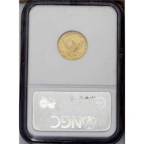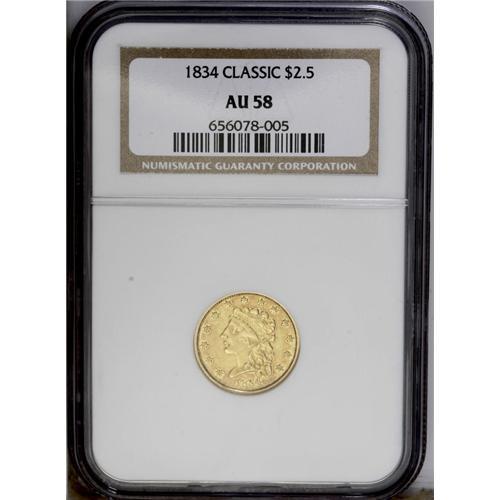 <B>1834<$2 1/2> AU58 NGC.</B></I> Large Head, Breen-6140, McCloskey-B, R.5. Bright luster beckons from the stars and legends of this reasonably struck near-Mint representative. Hints of rose toning adorn peripheral areas. A wispy obverse pinscratch at 10 o'clock barely merits mention. <BR><BR><B>Important notice:</B> Heritage usually auctions material at the rate of 200-250 lots per hour. On some occasions eBay Live bid software or the Internet may not be able to keep up with the pace of the auction. We recommend placing a realistic absentee bid now as insurance to avoid disappointment. Occasionally the auctioneer may eliminate or reject an eBay Live bid, and the auctioneer may also reopen a lot after the close of the eBay live bidding (usually because we missed an audience bid), and may reject your bid even if it shows you as the winning bidder. By bidding via eBay Live, you agree that Heritage may award the lot to another bidder at its sole discretion under the circumstances described above or any other reasonable circumstances. Since eBay bids are not shown to us until we open the lot on the floor, we treat those bids just like floor bids. In most cases the floor responds before the eBay bid is presented to us, due to Internet lag time, so for consistency we have made it a policy that floor bids are always considered first over tie eBay live bids. Also please note that all Heritage lots purchased through eBay Live carry a 20% Buyer's Premium. Please make sure you read the Terms and Conditions before you bid. This lot is being auctioned in conjunction with a live floor auction by Heritage Galleries & Auctioneers. All final auction and invoice information will be supplied by Heritage Galleries & Auctioneers, and all other information should be considered preliminary. Lot:2339 <BR><BR><B>Winning Notification and Billing:</B> After the FINAL session in this auction is complete, Heritage will send e-mail and snail mail invoices. This process normally takes several days. All final auction and invoice information will be supplied by Heritage Galleries & Auctioneers, and all other information should be considered preliminary. <BR><BR>This auction will be conducted on a live auction floor and over the Internet through eBay Live. If you choose to place an absentee bid, please take a moment to <font color='#0000ff'><u><a href='http://pages.ebay.com/liveauctions/help/before/laabsentee.html'>learn how eBay Live absentee bidding works</a></u></font><font color='#000000'>