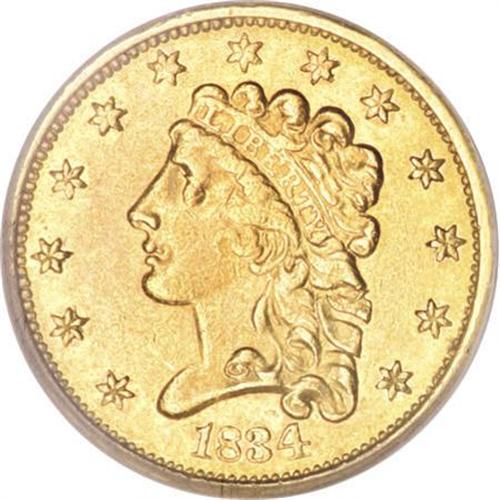 <B>1834 $2 1/2 Classic AU58 PCGS.</B></I> Large Head, Breen-6140, McCloskey-B, R.4. Deep green-gold coloration inhabits the surprisingly clean surfaces of this Classic Head quarter eagle, while traces of red-orange luster remain evident near the peripheries. The design elements are generally well struck, if a tad weak on just a few areas. Both sides of the piece are free of distracting marks, and highpoint wear is definitely not excessive for the grade.<BR><BR><B>Coin Engraver:</B> William Kneass<BR><BR><b>Shipping:</b> Coins & Currency (<a target="_blank" href="http://www.heritageauctions.com/common/shipping.php">view shipping information</a>)
