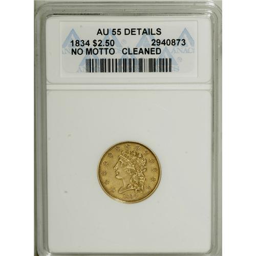 <B>1834 $2 1/2 Classic--Cleaned--ANACS. AU55 Details.</B></I> Large Head, Breen-6140, McCloskey-C, R.3. A glossy caramel-gold with noticeable luster and an above average strike. A bit bright, but will service as an example of this short-lived gold type.<BR><BR><b>Shipping:</b> Coins & Currency (<a target="_blank" href="http://www.heritageauctions.com/common/shipping.php">view shipping information</a>)