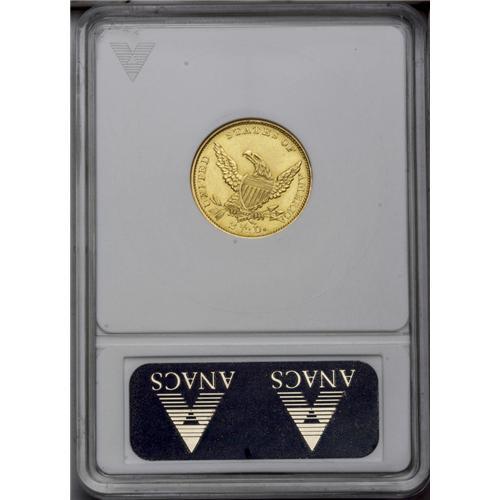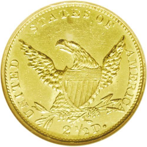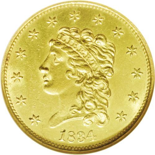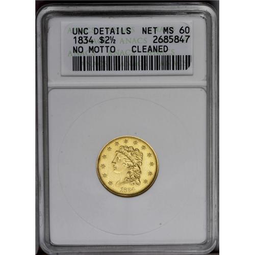 <B>1834<$2 1/2> Classic--Cleaned--ANACS. Unc Details, Net MS60.</B></I> Breen-6138, Small Head, R.2. This is the usually seen Small Head variety, representative of approximately half of all 1834 Classic Head quarter eagles. Although the surfaces are lightly hairlines, indicative of the cleaning process, the overall eye appeal is still good. Not fully struck, but sharper than usual for this design. Both sides have bright green-gold color with minor surface marks. The reverse is rotated about 30 degrees clockwise.