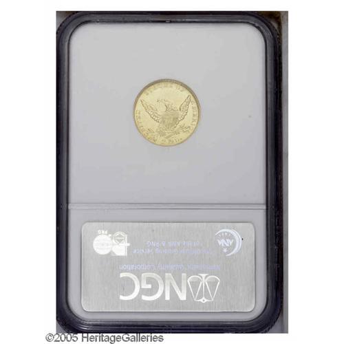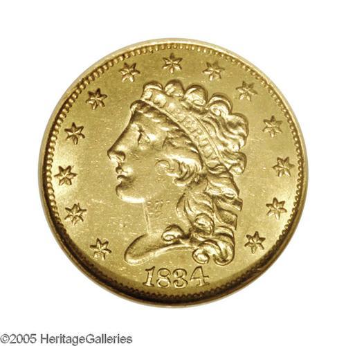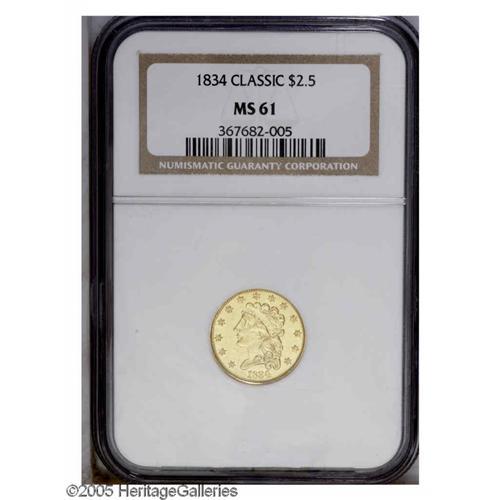 <B>1834<$2 1/2> Classic MS61 NGC.</B></I> McCloskey-A, Breen-6140, Large Head, R.3. A scarce Mint State example of this popular first year of issue for the Classic design. As with many 1834 quarter eagles, the fields of this piece are bright and semi-prooflike. The strike is soft, as usual, on the hair curls, and the surfaces show a few small marks, the only ones worthy of mention being a cluster of minor abrasions on Liberty's neck.